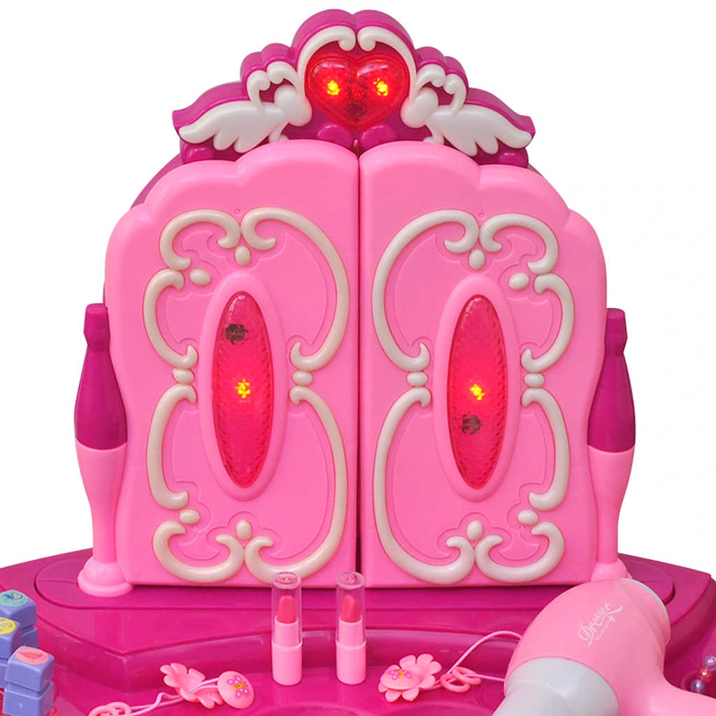 Inject your children’s life with a dose of glamour with this kid-sized fantasy vanity table! Your little make-up enthusiast or hair artist can get ready using the shatterproof, plastic cosmetic desk that's safe and functional. The dressing table has battery-powered, button-operated lights to illuminate the stylish mirror. When the heart-shaped button at the top is pressed, mirror walls are opened, music is played and the lighting on the mirror frame begins to light up. Moreover, the cute wind blower actually works like a real one! There's a pull-out drawer in the desk for organising the included beauty supplies. Its sturdy construction makes it durable and easy to clean. Your kids will not only love playing with this toy vanity table, but it will also help them to playfully develop communication and social skills. It is suitable for children of 3 years and over. This toy cosmetic table needs 5 x AA batteries, which are not included in delivery. Delivery includes: 1 x toy vanity table, 1 x stool, 1 x wind blower, 3 x nail polishes, 2 x bracelets, 2 x lipsticks, 3 x rings, 2 x hairband, 1 x necklace and 1 x comb.